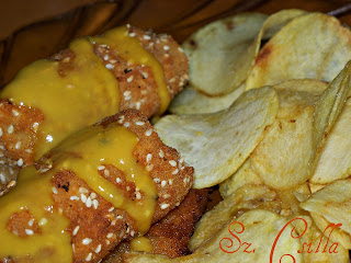 Persze nem kell chips-szel enni, de nekem most csak ez akadt itthon (vendégeinktől kaptuk szilveszterkor). Eredetileg panírozni akartam vele, de így se volt rossz - és meglepően finom volt a mézes-mustáros szósszal is. Ínyenceknek kötelező :)